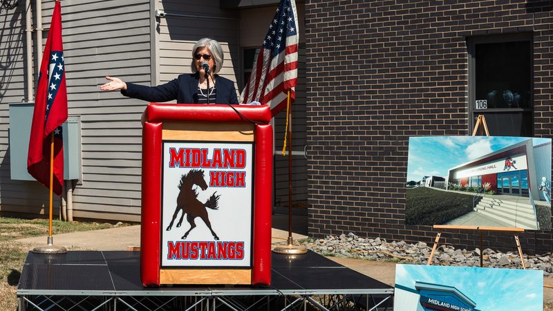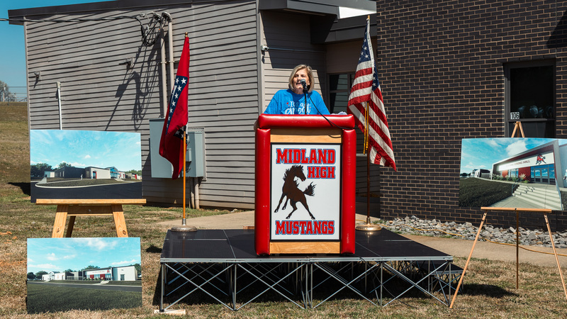 Former Midland Elementary Principal Bani’ Meharg delivered heartfelt remarks, reflecting on more than 50 years of connection to the district and celebrating the legacy, resilience, and pride that define the Mustang community.