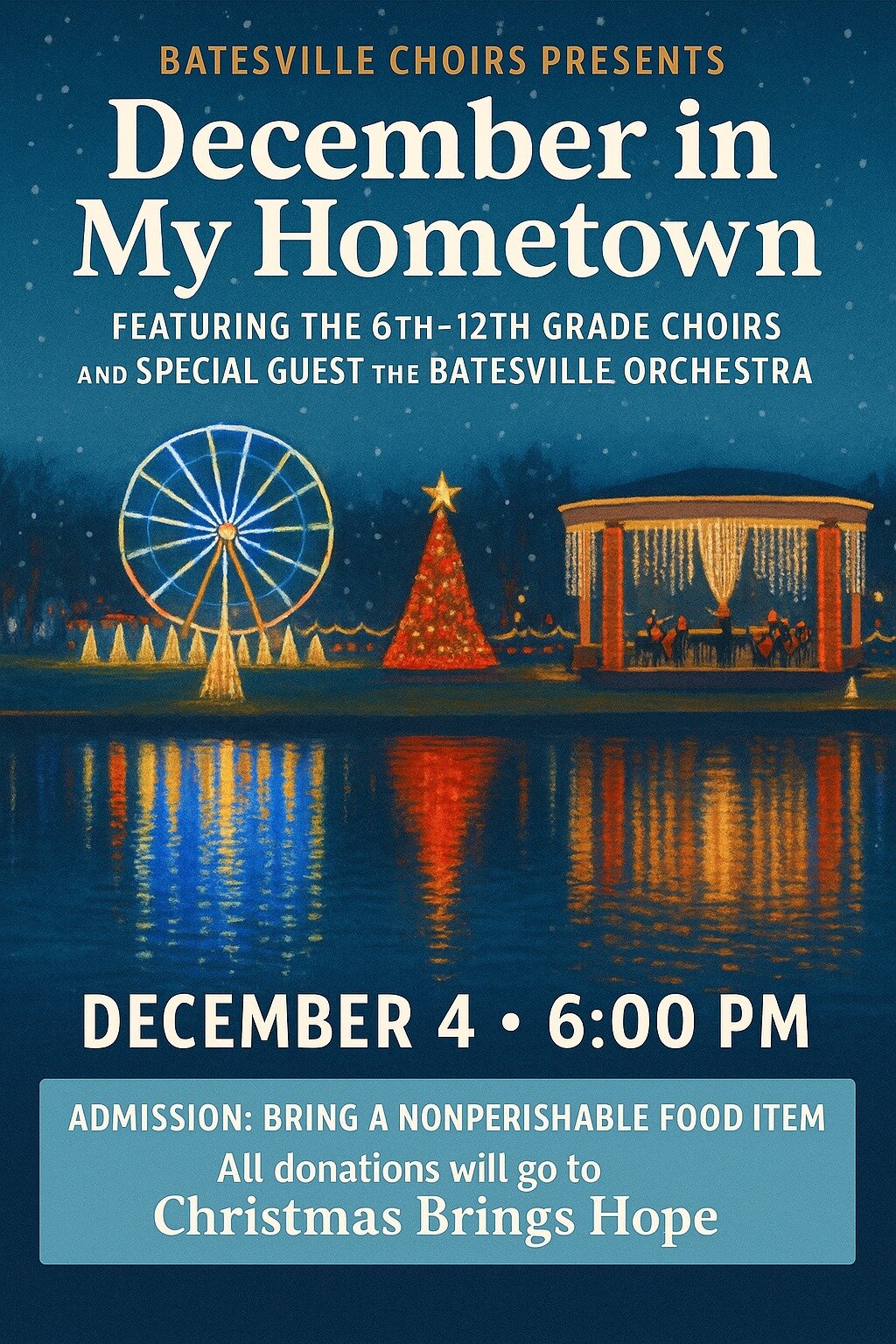 Join Batesville Choirs on Thursday, December 4 at 6 p.m. in the new Batesville Performing Arts Center for the Batesville Choirs' Winter Concert, December in My Hometown!