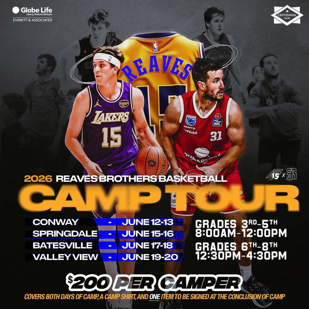 Supported by Centennial Bank and Globe Life Everett & Associates, the Reaves Brothers Basketball Camp Tour is a special opportunity for young players to sharpen their skills and connect with two Independence County athletes making their mark on the game.